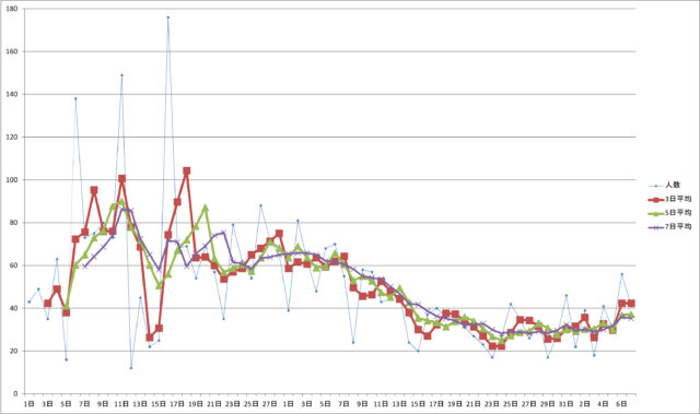 実数は上下動が激しいので、3日平均、5日平均、7日平均を加え、3日平均が上向いてきたら「感染者が再度増えてきてるのか?」と考えてもいいと思います。