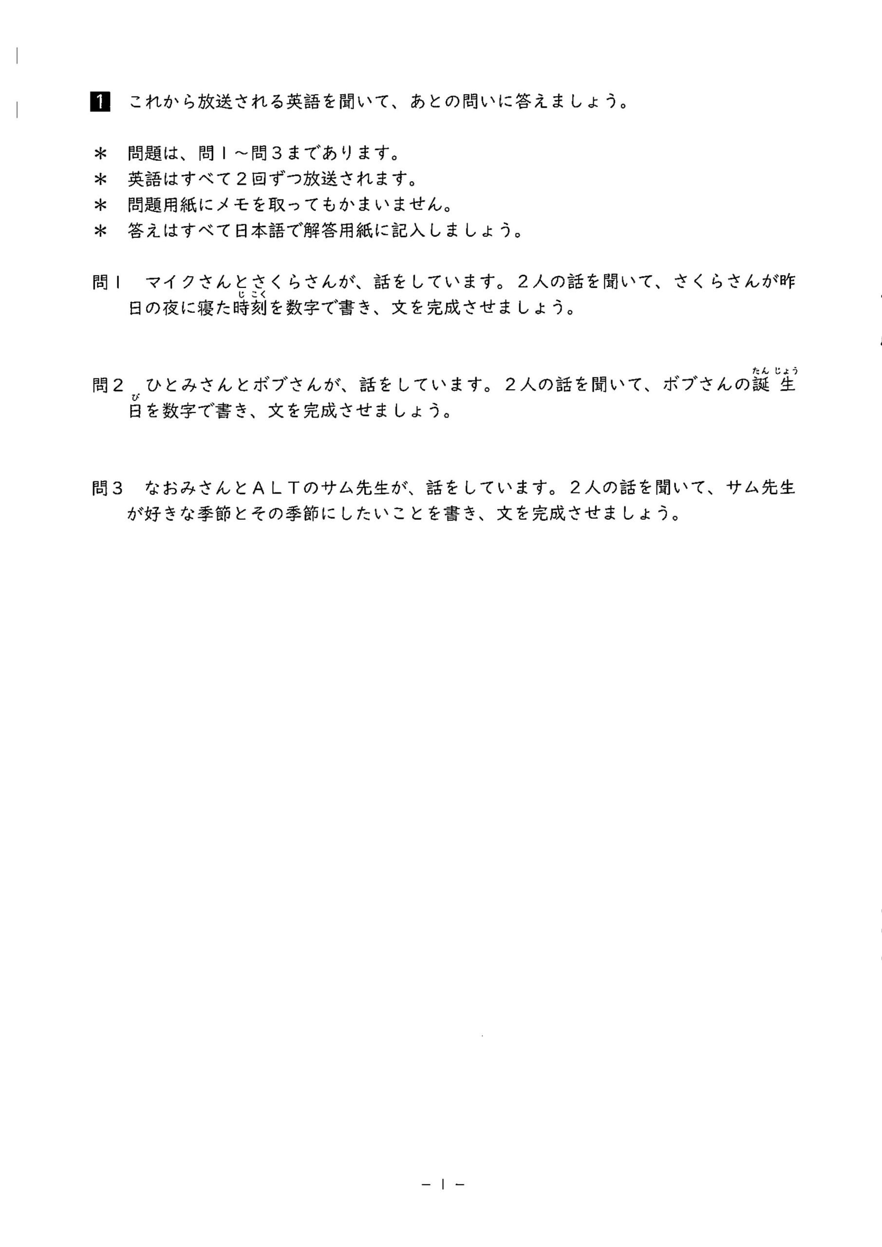 埼玉県立伊奈学園中学校の過去問、大問1、英語の放送問題です。