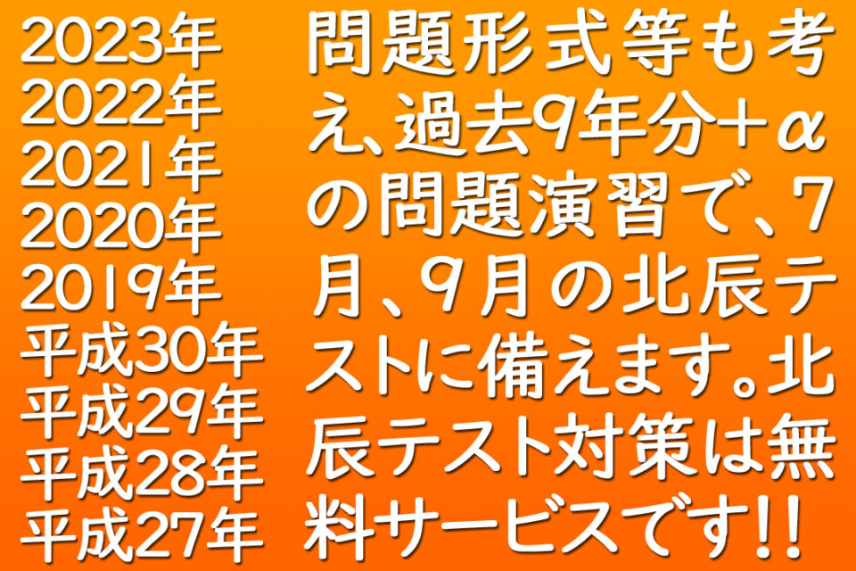 画像のとおり、北辰テスト対策は無料で実施していますので、7月&夏期&8月で一気に取り戻しましょう、差をつけましょう!