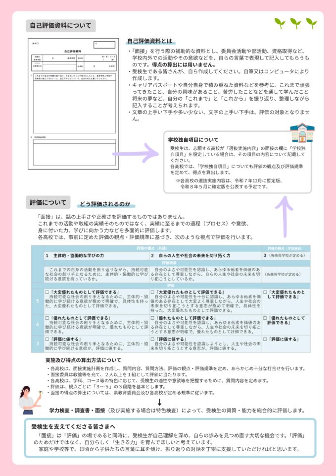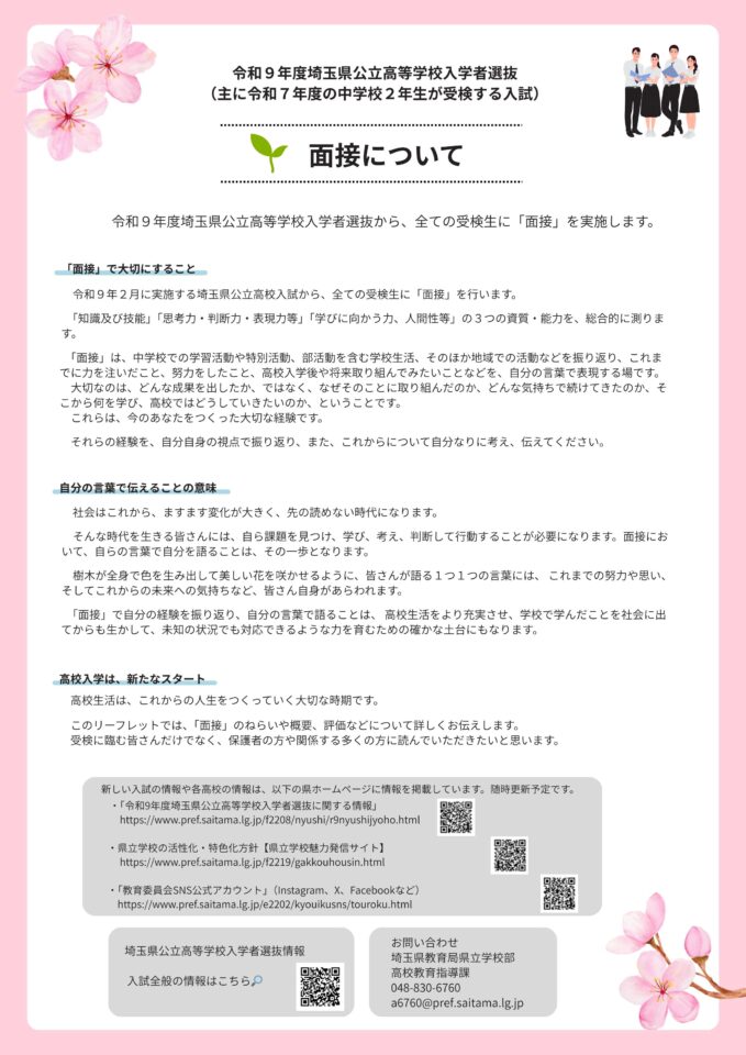 令和9年度埼玉県公立高等学校入学者選抜(主に令和7年度の中学校2年生が受検する入試)面接について 2025年9月1日 user 令和9年度埼玉県公立高等学校入学者選抜(主に令和7年度の中学校2年生が受検する入試)面接について https://www.pref.saitama.lg.jp/documents/257619/r9mensetsu_leaflet02.pdf